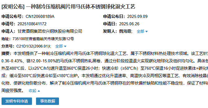 酒鋼宏興申請“一種制冷壓縮機閥片用馬氏體不銹鋼球化退火工藝”專利