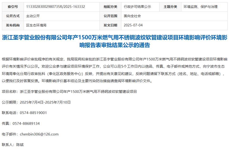 圣字管業(yè)年產(chǎn)1500萬(wàn)米燃?xì)庥貌讳P鋼波紋軟管建設(shè)項(xiàng)目環(huán)評(píng)獲批公示